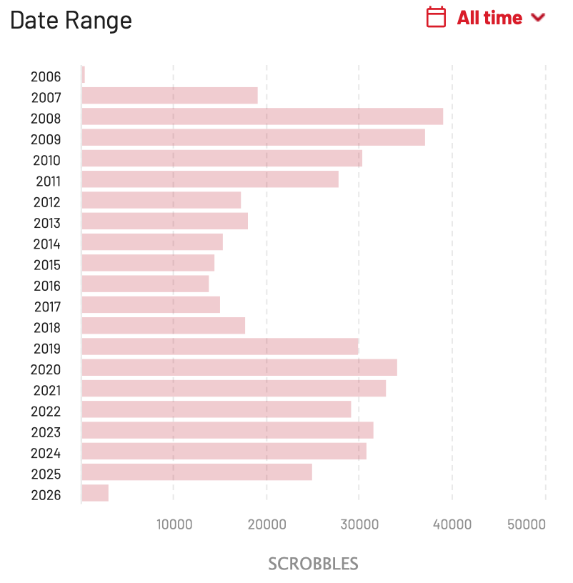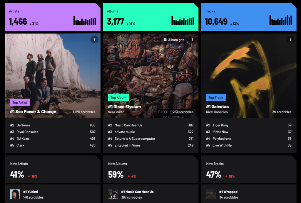 Na koniec, tradycyjnie, parę tradycyjnych statystyk z mojego profilu w serwisie Last.fm, gdzie na bieżąco można obserwować czego słucham, co odkrywam i czym się zachwycam.
