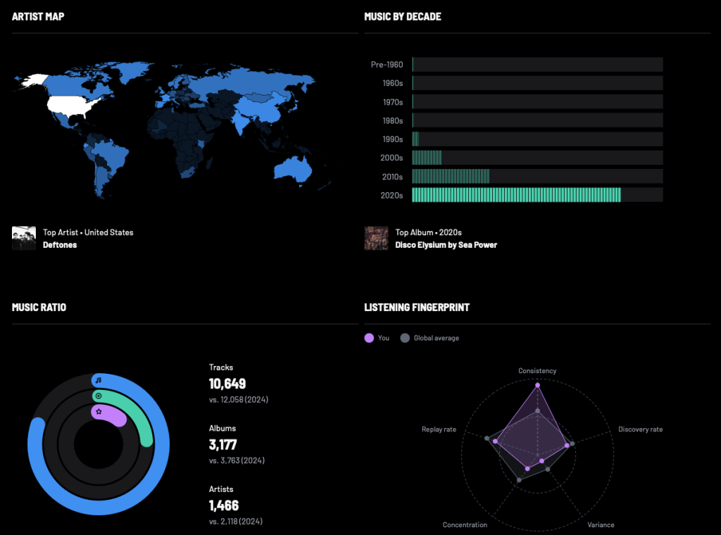 Może i podtrzymywanie tej tradycji już nikogo nie interesuje, poza mną, i nie wiem czemu co roku chce mi się na to poświęcać pół wolnej niedzieli, ale póki muzyka jest wciąż dla mnie tak ważna w życiu – chciałbym tej tradycji dochować. Nawet jeśli muzyki słucham statystycznie znacznie mniej niż w poprzednich latach. I podobnie wynika to głównie z podróżowania oraz zamiłowania do konsumpcji podcastów.